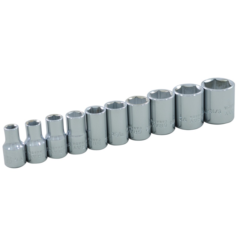 Contains Sizes: 3/16", 7/32", 1/4", 9/32", 5/16", 11/32", 3/8", 7/16", 1/2", 9/16".Drive Type: 6 PointDrive Size: 1/4"Mirror chrome finish for maximum resistance against corrosion.Made from premium tool steel for maximum durability.Ideal for use on stubbor