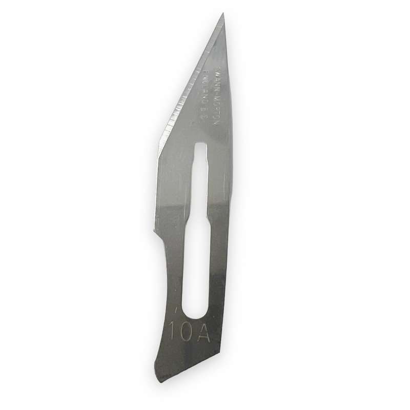Swann-Morton scalpel blades are known for their high-quality performance, and consistency. Non-sterile, carbon steel #10A style features triangular blade sharpened along the hypotenuse edge and with a strong pointed tip. Ideal for mold cutting. Made in Eng