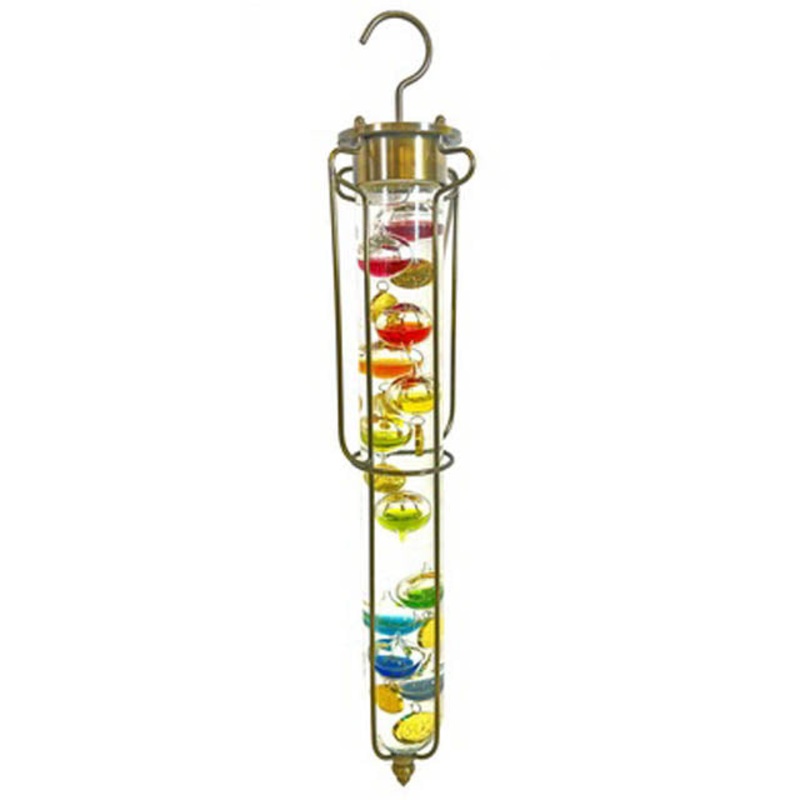 The Hanging Galileo Thermometer is a home dcor weather instrument that tells you the temperature. Brightly colored glass spheres rise and fall to gauge different degrees. The lowest sphere at the top of the thermometer indicates the correct air temperature. Decorative accessory can hang in any room porch or patio.