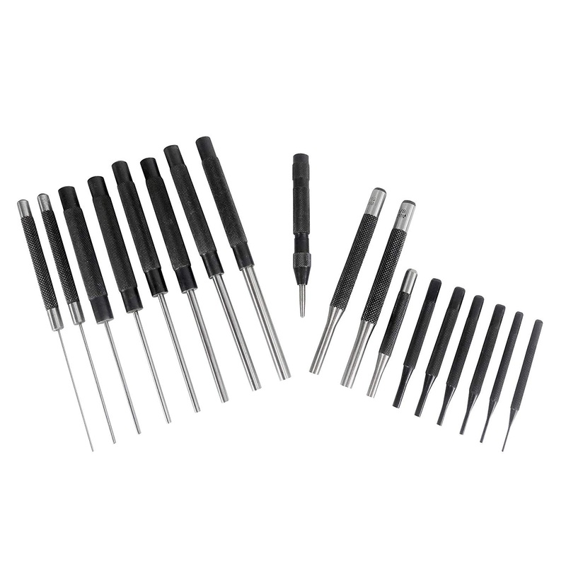 Taytools 18 piece Pin Punch Set with 8 each long (8"), 9 each short (4") and automatic center punch set is designed to accurately make holes and drive pins through holes. Each punch is made from hardened and tempered tool steel optimal for strength and dur