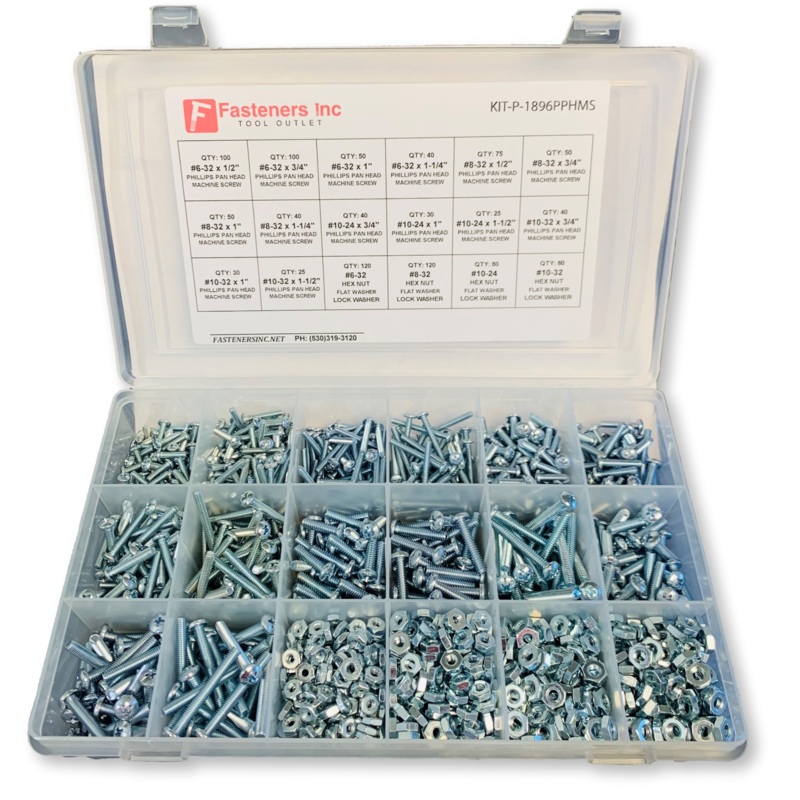 KIT SIZES/QUANTITIES INCLUDED:Phillips Pan Head Machine Screws(100) #6-32x1/2(100) #6-32x3/4(50) #6-32x1(40) #6-32x1-1/4(75) #8-32x1/2(50) #8-32x3/4(50) #8-32x1(40) #8-32x1-1/4(40) #10-24x3/4(30) #10-24x1(25) #10-24x1-1/2(40) #10-32x3/4(30) #10-32x1(25) #1