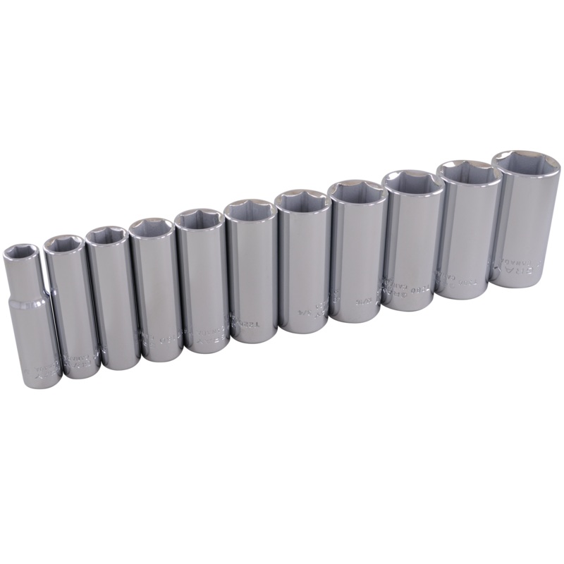 Contains Sizes: 3/8", 7/16", 1/2", 9/16", 5/8", 11/16", 3/4", 13/16", 7/8", 15/16", 1".Drive Type: 6 PointDrive Size: 3/8"Mirror chrome finish for maximum resistance against corrosion.Made from premium tool steel for maximum durability.Ideal for use on stu