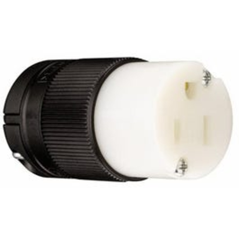 Clamp-Lock Straight Blade Connector, 15A 125V, NEMA 5-15R, Black & White. Self-centering cord grip helps speed assembly. Removable inserts accommodate the widest possible range of cable diameters. Rugged nylon housing and backbody withstand chemicals, heat
