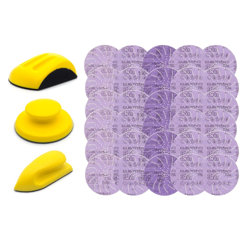 This cost-saving bundle includes a mega-pack of 30 Cubitron II 5 Hookit sanding discs (3 each of 80, 120, 150, 180, and 220 grit and 5 each of 240, 320, and 400 grit) along with a round, detail, and mouse-shaped sanding block.3M 775L Cubitron II Sanding Discs:3M 775L Cubitron II sanding discs are widely regarded as the best on the market, featuring proprietary Precision Shaped Ceramic Grain technology. This revolutionary abrasive material uses sharp, triangular-shaped ceramic grains that slice through substrates rather than gouging or plowing like traditional abrasives. As a result, Cubitron II discs cut up to twice as fast and last up to six times longer than conventional discs. The 3-mil film backing adds tear resistance and edge durability.3 Piece Hand Sanding Block Set:These hand-sanding blocks are constructed from durable, medium-density polyurethane foam. The pads hook-and-loop backing accepts 5 sanding discs. It allows for quick and secure attachment and removal of sandpaper, ensuring efficient disc changes and extending the life of sanding discs.These blocks can be used wet or dry, making them ideal for autobody and paint shops, detailing, woodworking, furniture making, metalworking, drywalling, and various household or crafting projects.”Mouse” Block: Sandpaper can be wrapped around the sides of this block to sand inside and outside contours, as well as other hard-to-reach areas. It features three finger slots for added grip and better control during sanding. Size: 5″ 3-1/4″ 1-1/2″.Detail Block: This block fits perfectly in your palm, providing extra grip and even control when sanding tight corners, contours, and other narrow areas. Size: 4-5/8″ 2-1/8″ 1-5/8″5″ Round Block: Designed for larger surfaces, this block accepts standard 5″ sanding discs. It has a 3″ diameter raised handle for improved grip and control during sanding.WARNING: Cancer and Reproductive Harm -www.P65Warnings.ca.gov