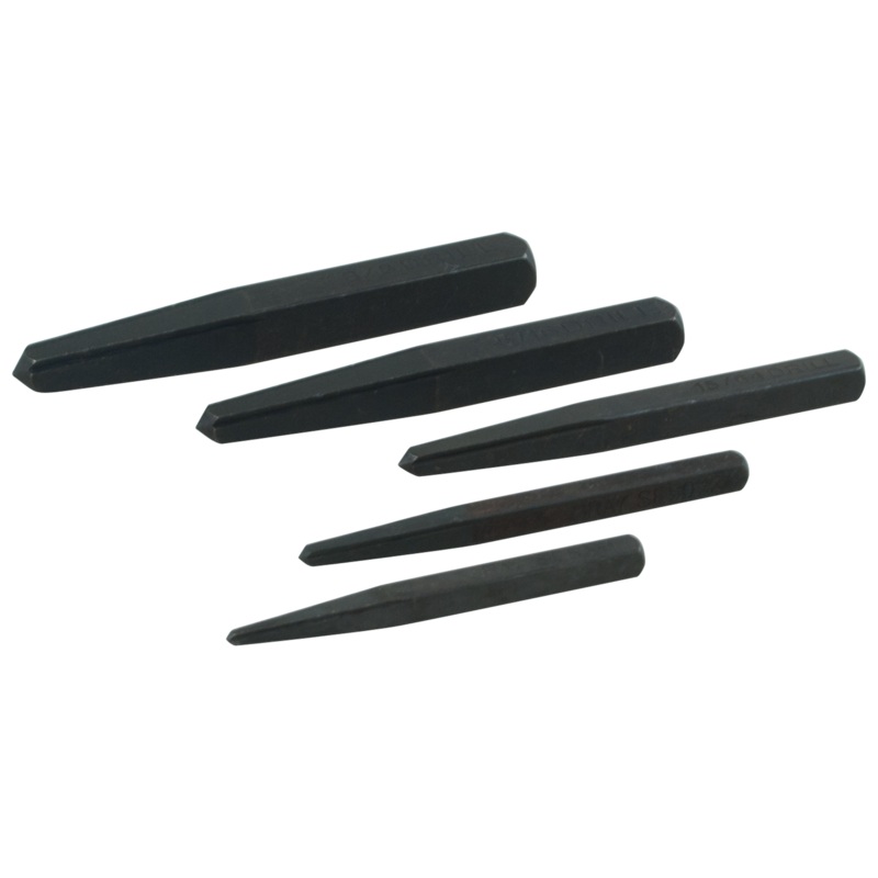 Contains extractors for screws, stud or bolt sizes: 1 1/4", 2 3/8", 3 7/16", 4 1/2" and 5 5/8".Straight, tapered flutes provide a securely and firm grip.Packaged in: vinyl pouch