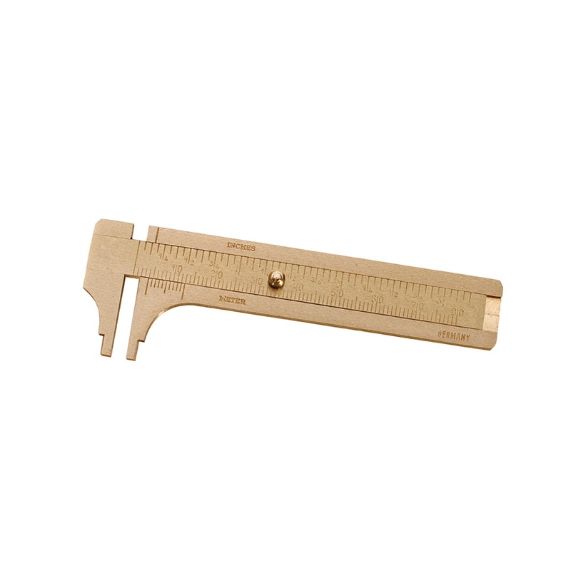 A solid brass gauge that offers a combination of inches and millimeters. Features notched jaws for inside and outside measurements, along with a 1/10th millimeter vernier for precision and accuracy. Also available at a value price.