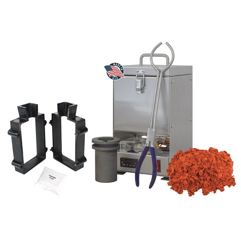 This inclusive set is ideal for metal melting and sand casting applications! Includes a 60 Oz TableTop Furnace Quikmelt Pro, (5) lbs of Quick Cast Sand Casting Clay, a 2-Piece Cast Iron Mold Flask Frame, Graphite Crucible, Ring Tongs, Parting Powder, and Anhydrous Casting Flux.