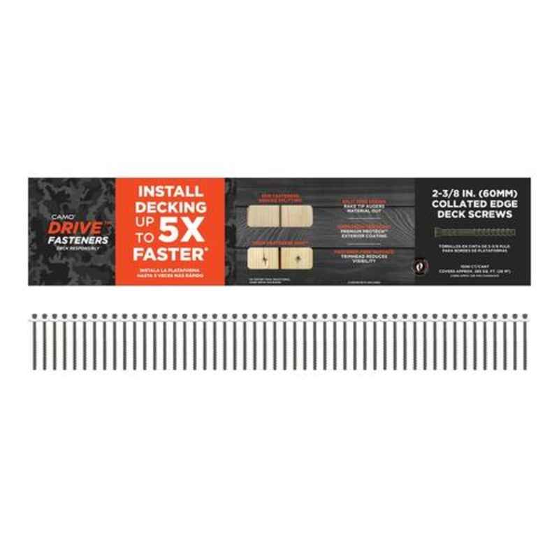 Any wood or composite board in any square or grooved board profile, Edge hidden deck screws are the best way to enjoy the beauty of your deck top without seeing your fasteners. Edge hidden deck screws are installed on the edge of the deck board, hiding the fastener while protecting the face of the deck board. The rake tip design of the screw augers material as it is driven, leaving you with a fastener free deck surface that is less prone to splitting and cracking. Not only does this system improve the overall look of your deck, but it holds stronger than a traditional face fastener. When a deck board is face fastened, the head of the screw or nail is keeping your board in place. Edge hidden deck screws leverage the strength of the entire screw to hold your deck board in place. These collated deck screws are designed for use with the CAMO DRIVE deck tool for wood or composite decking. CAMO DRIVE allows you to install deck boards standing up. It is a fast, easy, versatile, and affordable deck tool that installs three types of deck screws: Edge, Face and Universal Deck Clips. Edge Hidden Deck Screws are easy to install using either the CAMO DRIVE system or the CAMO MARKSMAN system. Available in PROTECH exterior coating and 316 stainless steel.