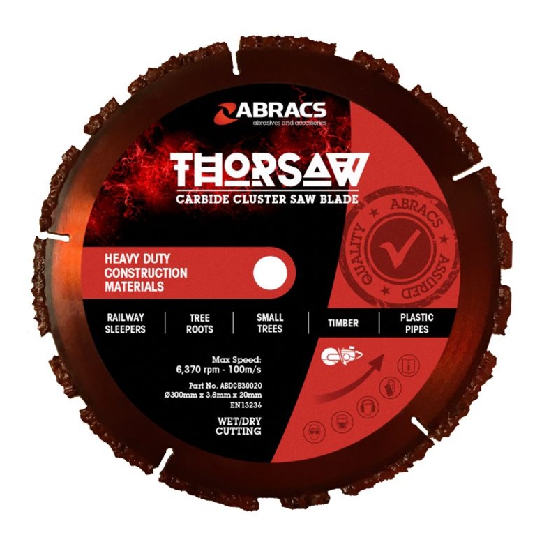 The Abracs Thorsaw Carbide Cluster Blade will make light work of certain applications a diamond blade or chainsaw cant. With a steady and precise cutting line, the Thorsaw will tear through railway sleepers, tree roots, plastic pipes, timber, small trees and much more – making it a must have.