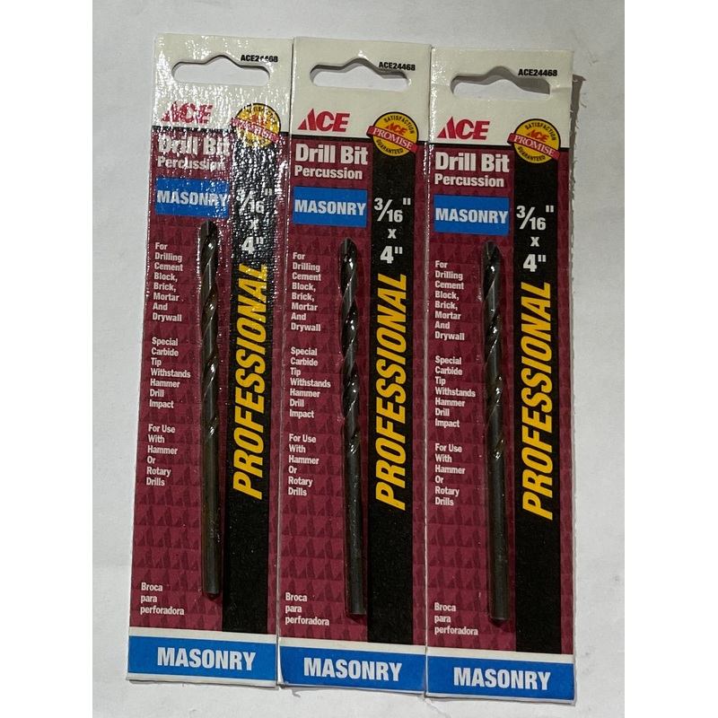 Ace ACE24468 3/16" x 4" Professional percussion masonry drill bit 3pksFor drilling cement block, brick, mortar and drywallSpecial carbide tip withstands Hammer drill impactFor use wit Hammer or Rotary drills