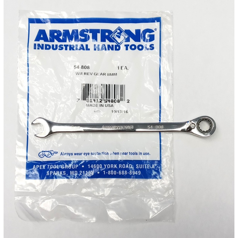 Armstrong 54-808 8mm Reversible Ratcheting Combination Wrench USAWrenches, Combination - Reversible Ratcheting, 8mm, 12 Point, Full PolishThe box end may not be centered (see photos). The quality on some of thesewasn't up to Armstrong'susual standard.They