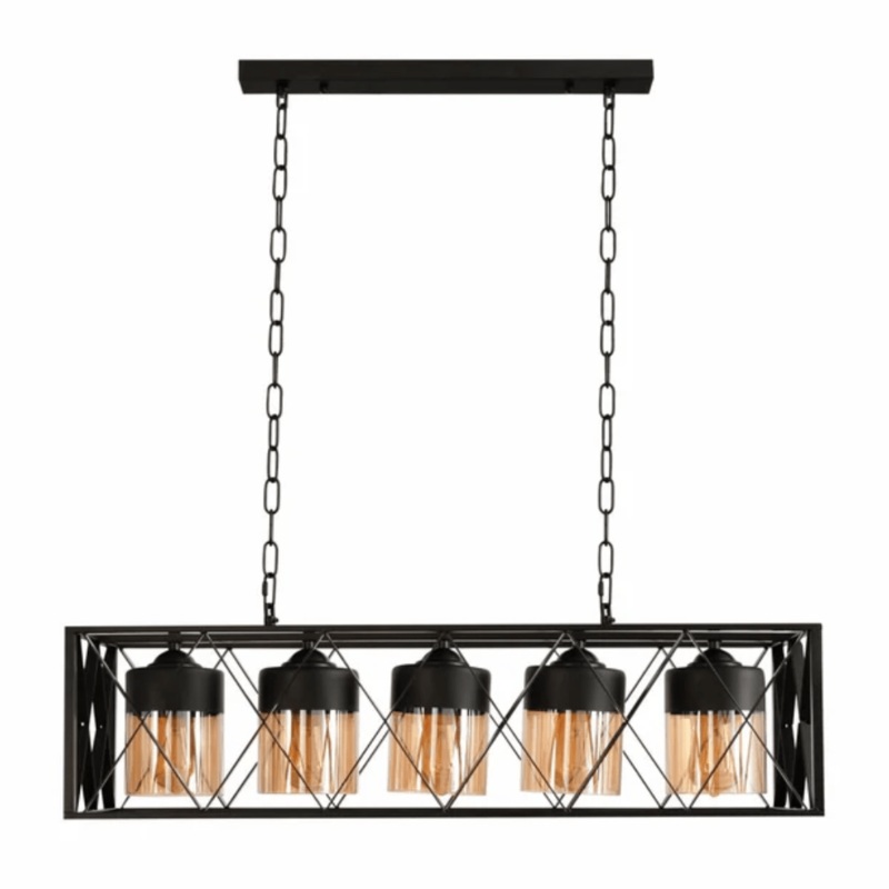 Industrial Charm Meets Warm Elegance Add a bold statement to your space with the Black Caged Metal Amber Cylinder Glass Island Chandelier. Featuring five amber glass cylinders encased in sleek black metal cages, this chandelier delivers a perfect blend of