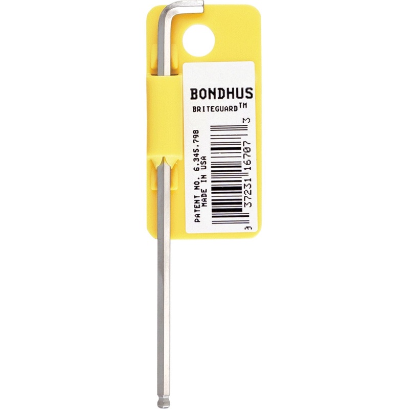 General InformationBrandBondhusPart Number16708_5Product Type Ball End Hex L-WrenchNumber of Pieces5PackagingBulkCountry of OriginUnited StatesUPC037231167080California ResidentsProposition 65 WarningPhysical CharacteristicsLength4.0 InchWeight0.28 kg0.63 lbFinishBriteGuard FinishDetailsTip TypeHexSize 9/64 InchTip StyleBall EndFeaturesFits into tight spaces standard hex keys can not