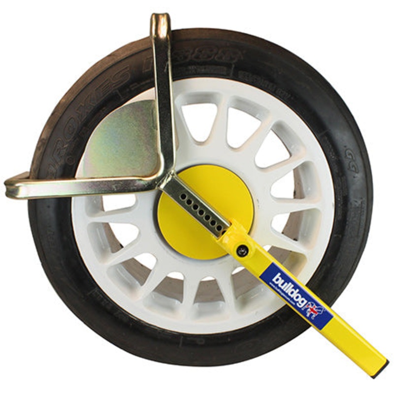 Bulldog Autoclamp is lightweight and made from high quality materials. It is easy to fit and will fit a wide variety of wheel sizes. Features: 3 sizes available Suitable for cars, vans, caravans, motor homes and trailers Guarantee of 5 years 3 arm design F