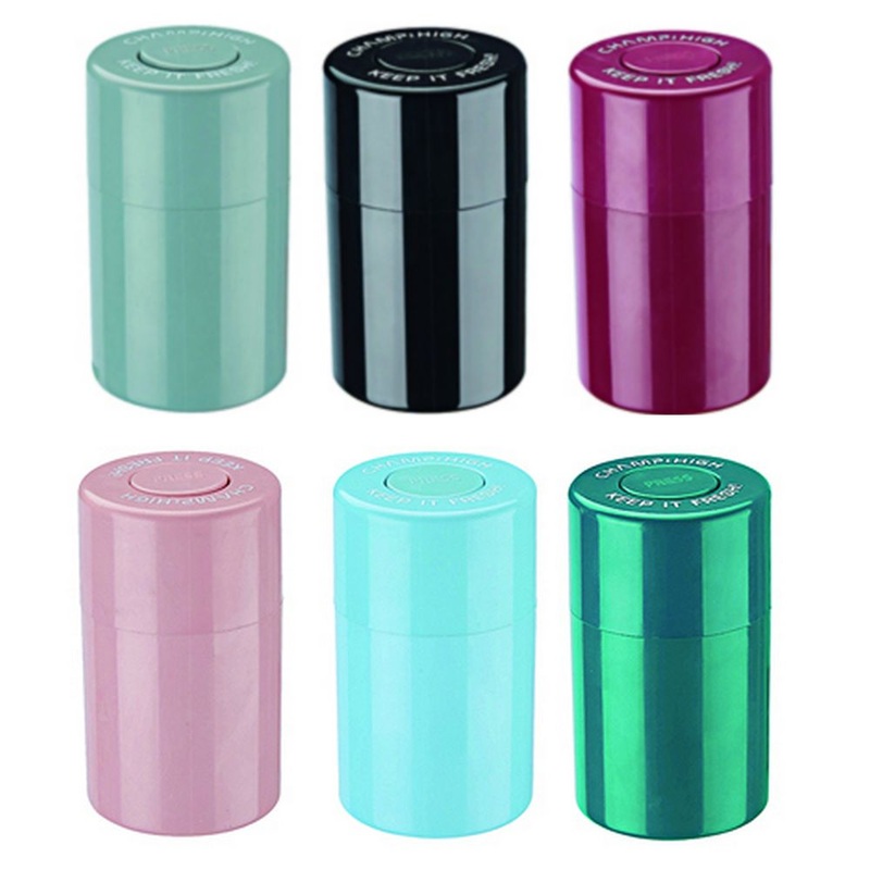 CHAMP-HIGH lufttt og lugtfri storage box til opbevaring af f.eks. rullede cigaretter. Produktet er en cylinder 10 cm hj og ca. 6 cm i diameter fremstillet af kunststof. Dsen bnes og lukkes med et tryk p knappen i toppen - man fornemmer at det skaber et vak