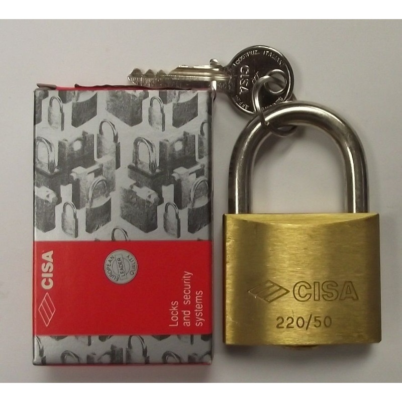Cisa 22010-50-0-0000-KC 50mm PadLock Brass Lock Made in Italy 1 KeyOverall size: 1-15/16" Wide 3" Tall 11/16" Thick 5/16" Shackle 1-1/8" Inside ShackleTechnical features:Belt sanded solid brass body.Nickel-plated, carbonitrided steel shackle.Shackle double