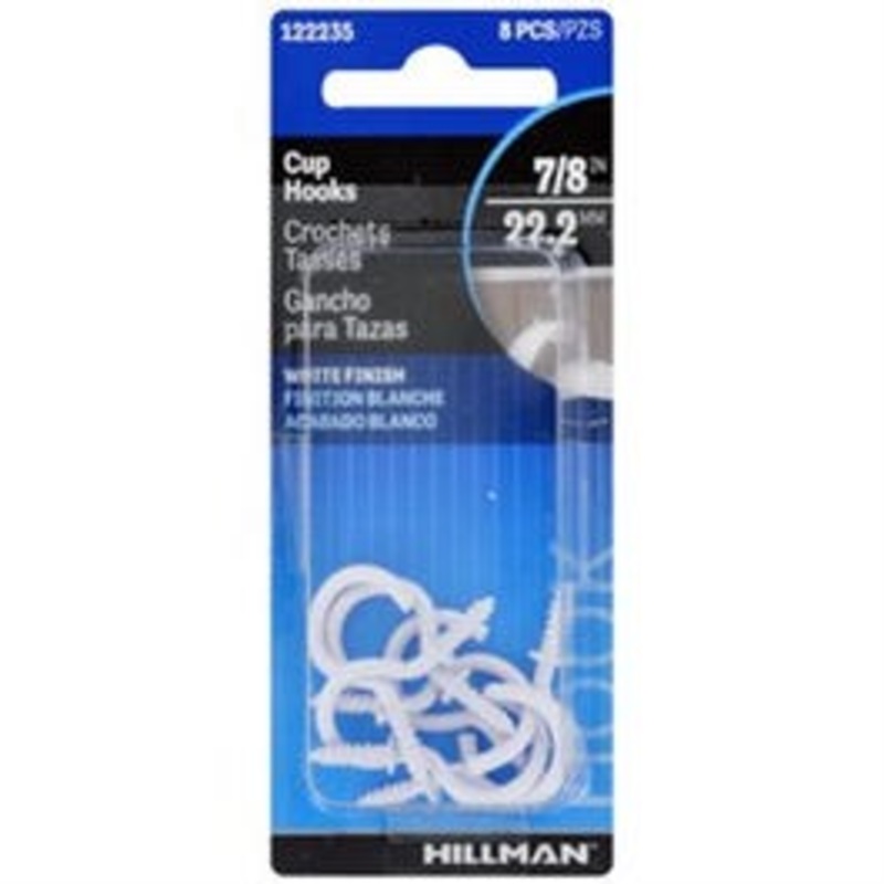 8 pack, 7/8", white, cup hooks, great to use in home day projects use to organize mugs in a coffee corner, or hangs small items cup hooks are available in several finishes & sizes.