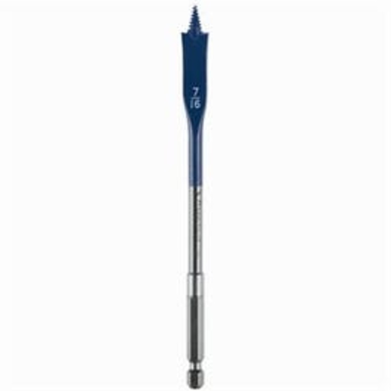 Daredevil, 7/16" x 6", spade bit, features a full cone threaded tip for fast & effortless drilling, contoured paddle for fast chip removal, spur & reamer tips for cleaner holes, 1/4" hex shank, 5" drilling depth.