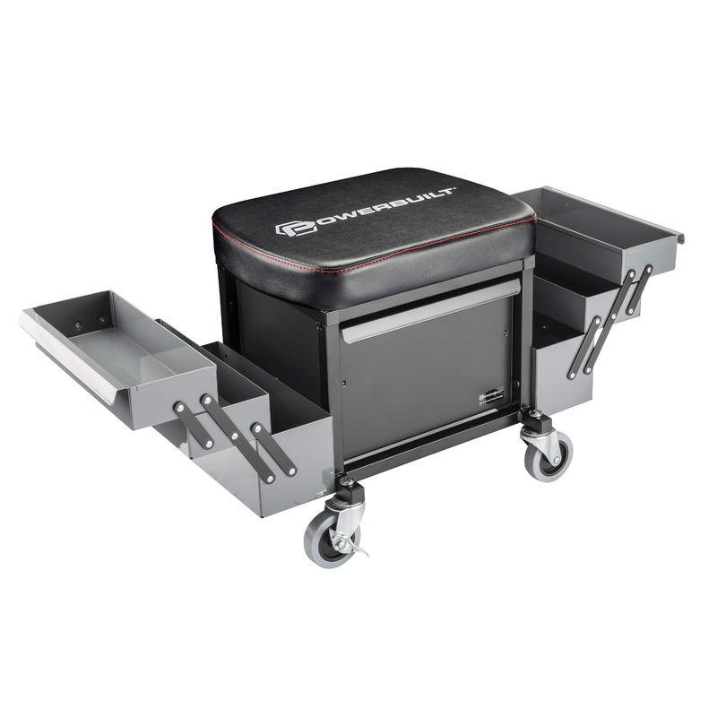 Revolutionize your workspace with this unique rolling seat, offering a clever design that keeps your tools and accessories within arm's reach. The Powerbuilt Deluxe Rolling Stool with Expandable Tool Trays features three-tier fold-out trays on each side to