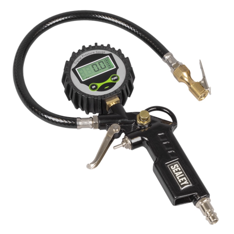 Pistol grip tyre inflator with digital gauge and rubber protector. LCD display screen for accurate and easy-to-read measurements. Calibrated in psi, bar and kPa. Fitted with 440mm flexible hose with high flow clip-on connector. Hanging handle for easy stor