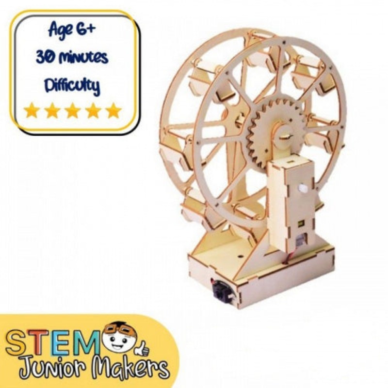 FUN TO BUILD Wooden parts for the Ferris wheel structure Some double-sided tape Connecting wire 1 x AA battery holder 1 x Wooden filer (For sanding) 1 x DC motor 1 x Switch 1 x Wood glue