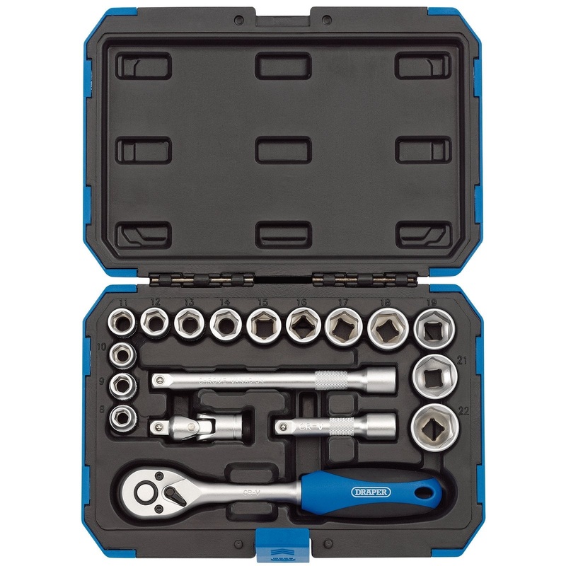 Six point socket made from chrome vanadium steel that's hardened and tempered with a satin finish. Supplied with a 72 tooth reversible soft grip ratchet and accessories. Packed in a plastic storage case. Manufactured and tested generally in accordance with