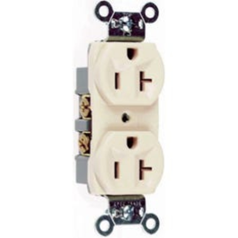 20a, 125v, light almond, 2 pole, 3 wire grounding, heavy duty duplex outlet, nema 5-20r, ul, csa, superior blade retention prevents plugs from falling out, screw pressure plate back & side wire termination accepts #14 through #12 awg stranded & solid copper wire, auto ground clip, unbreakable face & back body prevents devices breakage, commercial/specification grade.