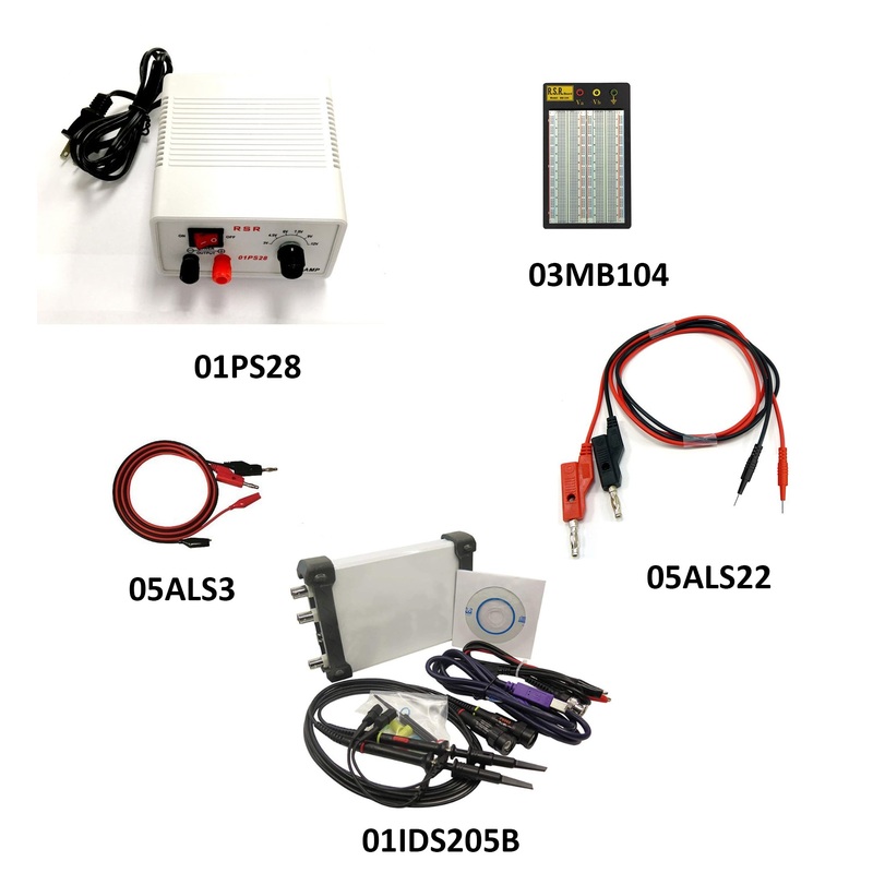 Equipment Bundle Sample Consists of:1. (01PS28) DC Power Supply 3V - 12V @2A2. (03MB104) Solderless Breadboard Model MB1043. (05ALS3) Test Leads - Banana to Alligator Test Lead Set4. (05ALS22)Banana to Test Pin 36"5. (01IDS205B) Dual Channel USB Digital Os