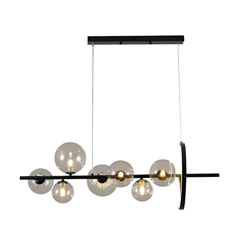 The Expanse Ring Black LED Island Chandelier is a striking blend of modern sophistication and timeless elegance. Featuring a sleek black metal ring frame adorned with clear globe glass shades, this chandelier emits a soft and ambient glow. The built-in LED lighting ensures energy efficiency, making it an ideal choice for dining rooms, kitchen islands, and contemporary interiors.