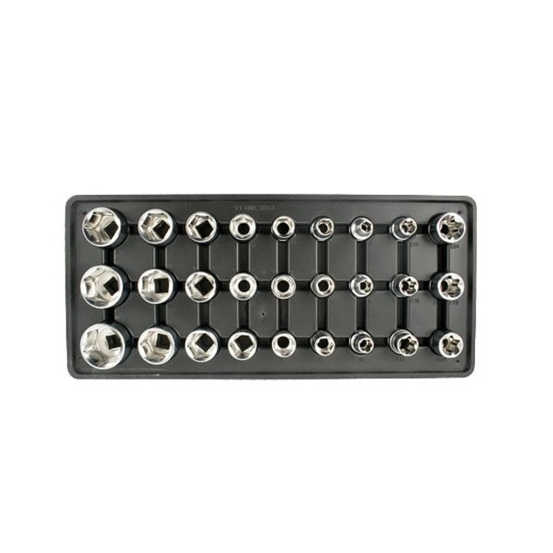 • The set consists of ” drive sockets in sizes 8mm to 32mm and TORX sockets E14 to E24