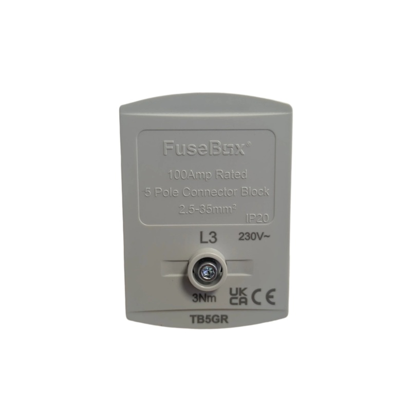 100A Single Pole Mains Connector Block Grey Fusebox TB5GY Can accept up to 5 conductors with a generous cable capacity from 2.5 to 35mm2. Secure cover with wire locking capability to aid the installation process. Dual screw terminations to ensure secure an
