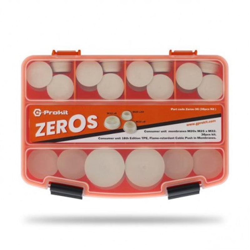 Flame-Retardant Membrane Kit Box - 36 Pack G-Prokit ZEROS-36 Consumer unit fire-rated membranes TPE - Flame retardant Qty 20 x 20mm Qty 8 x 25mm Qty 8 x 32 mm The G-Prokit ZEROS-36 Flame-Retardant Membrane Kit Box is a must-have for consumers concerned abo