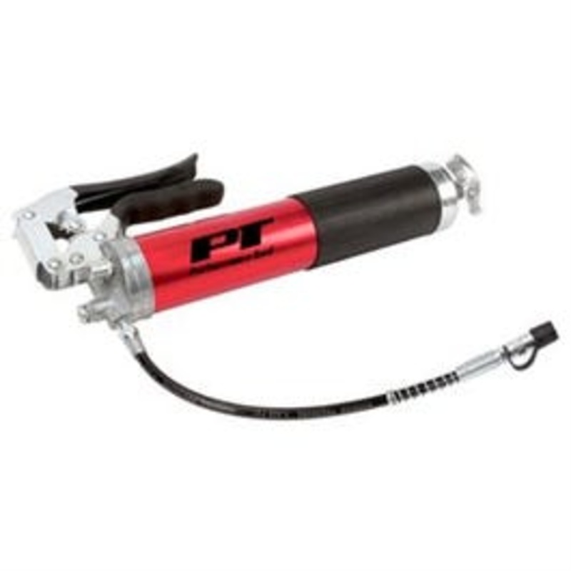 Heavy duty, aluminum pistol grip, extremely lightweight aluminum anodized barrel, pistol grip style with pvc grips, extra heavy t-handle & internal return spring, 3 way loading, accepts standard 14 oz cartridge, 4 jaw coupler with protective pvc cap, textu