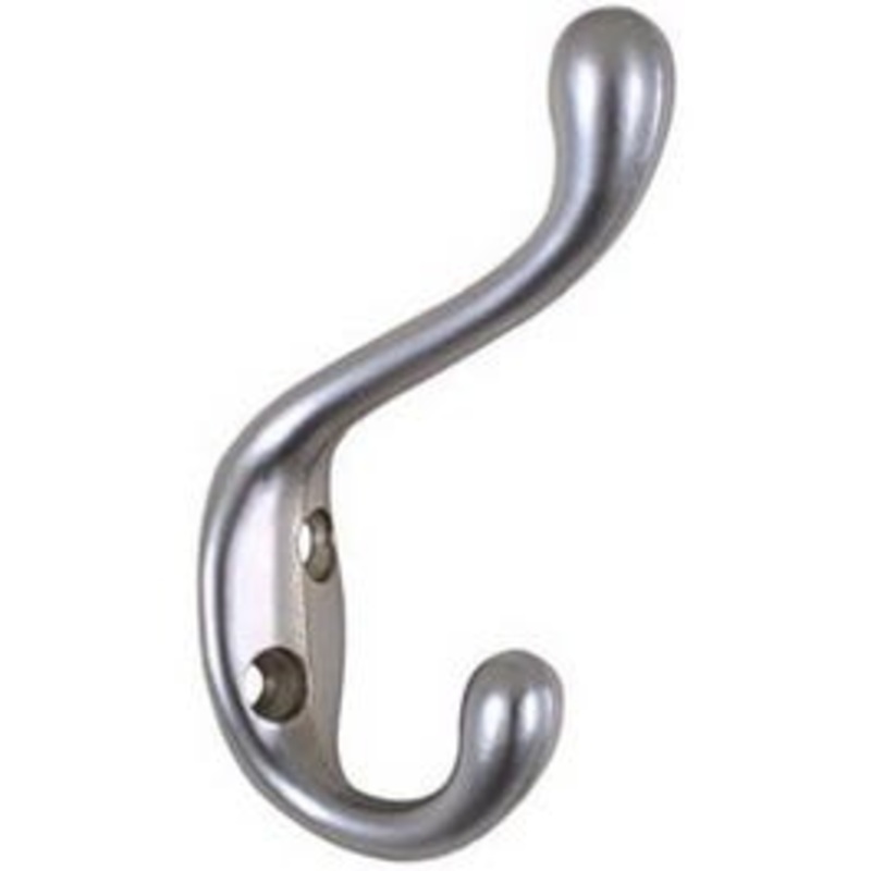 Heavy duty satin chrome coat & hat hook, decorative, general purpose hook, with screws.