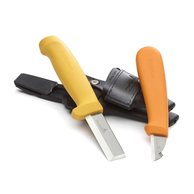 Double holster including the chisel knife STK and the electricians knife ELK. The chisel knife is a robust knife with V-shaped grinded chisel function. The sharpening of the blades different edges and the design of the handle of the electricians knife is o