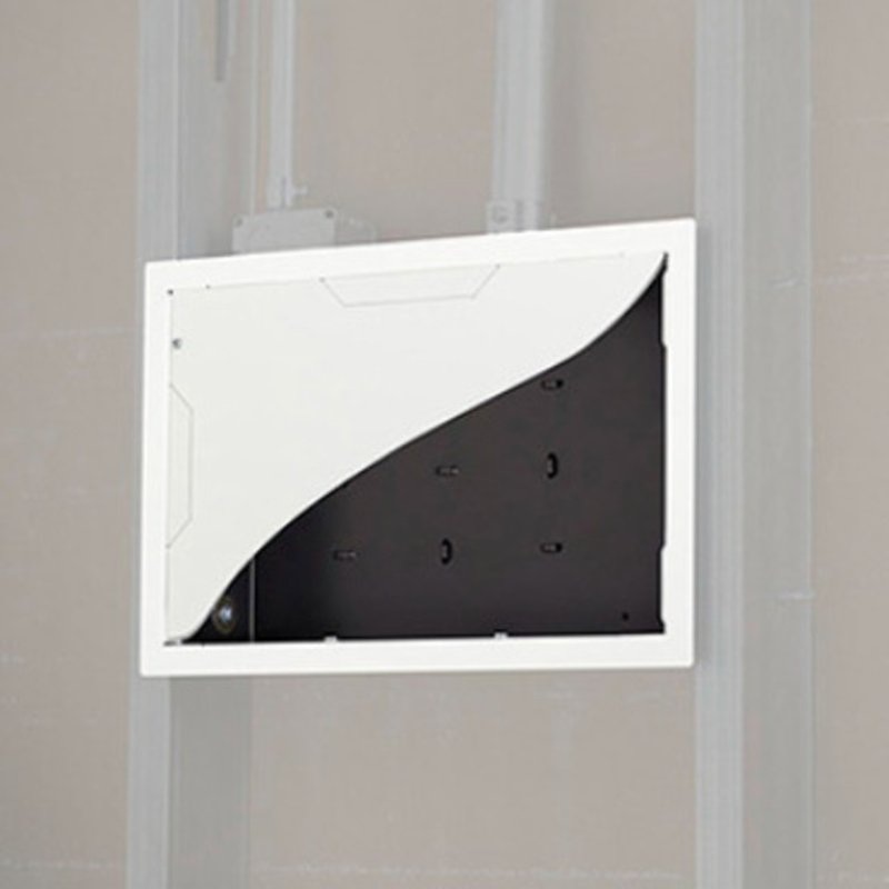 In-Wall Storage Box with Flange and Cover, Allows Compatibility With Standard 3.5″ Studs & 2.5″ Studs, Drywall And Stud Mountable, Knockouts For Single Gang Outlets And 1-1/4″, 1″, & “Conduit, Integrated Universal Zip Tie Anchor Points, Enclosure UL 2416 Listed For Installation Of AV, IT & Communication Technology Equipment: Stores A Large Variety Of AV Components, Landscape/Portrait Installation, L: 9″, H: 14.25″ , D: 3.9”, White