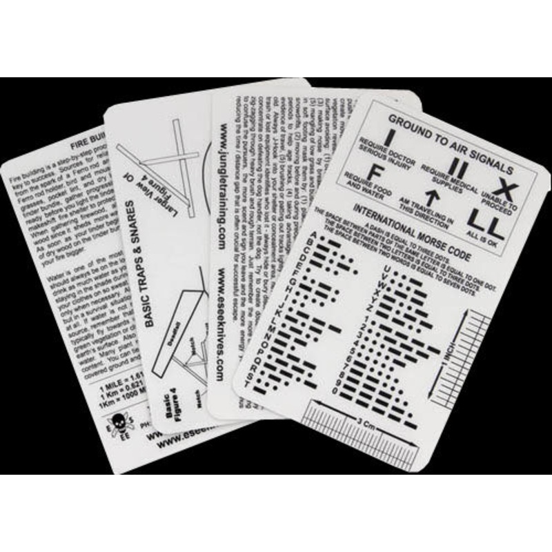 ESSE Izula Gear Survival Cards Printed on 30 mil plastic credit card stock Four white cards Survival tips Signaling tips Morse code Trap and Snare diagrams Fire building tips Navigation tips Escape and Evasion tips and much more Made in the USA