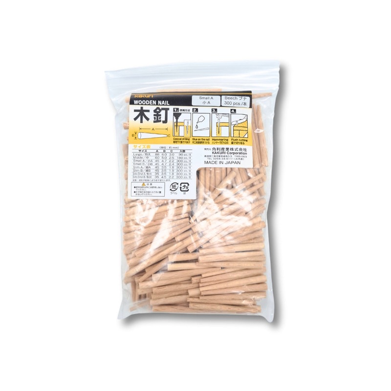 Wooden NailsW. Birch 45mm Wooden NailsQty: 300Why Wooden Nails? Japanese people have long used wooden nails for furniture, paulownia boxes, and other wooden products."Wooden Nails" VS "Dowel Rods "Wooden nails are different from ordinary dowels in that the