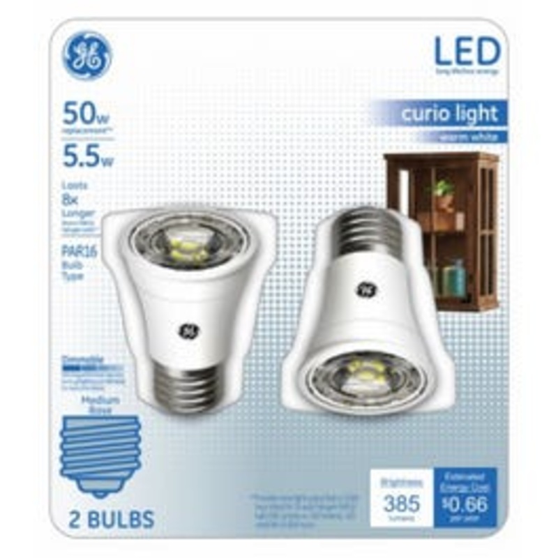 GE, 2 Pack, LED6DP16CUR-OT2P, 5.5W, Warm White Light Color, Clear Bulb Color, Par16 Shape, Spot LED Light Bulb, Equivalent To A 50W Incandescent, 10 Degree Beam, Medium Base, Dimmable, 385 Lumens, 3,000 Kelvin Color Temperature, CRI = 80, 13 Year, 15,000 Hours Rated Life, MOL = 2.70″, Curio Light, Carded.