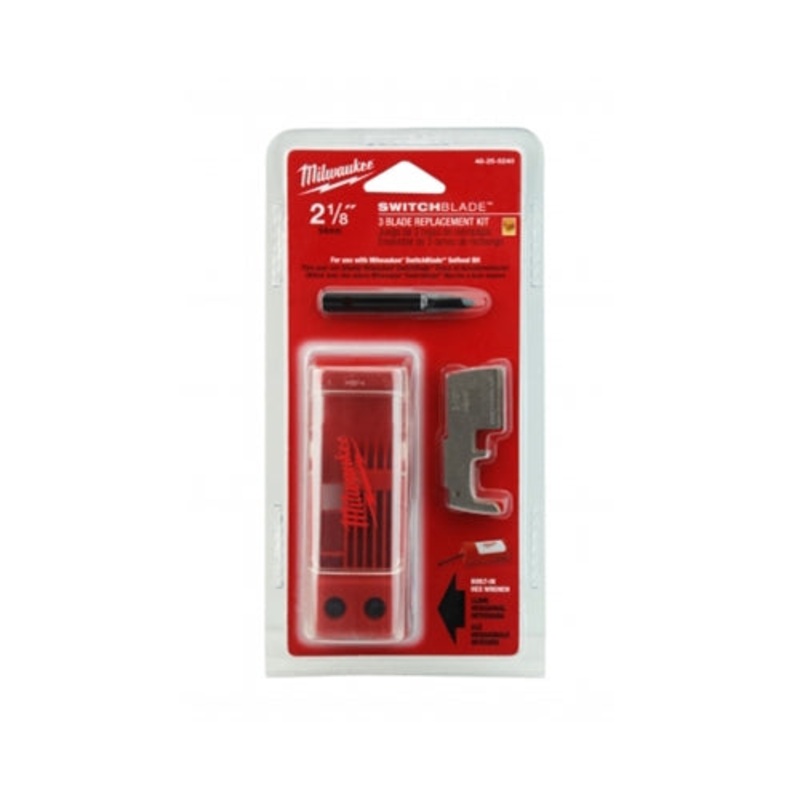 Milwaukee 48-25-5240 Includes (3) 2-1/8" Switchblade Selfeed Bit Blades (1) Feed Screw (2) Set Screws Built-in Hex Wrench with Storage Case Milwaukee 48-25-5240 Features Storage case holds up to 5 blades. Small enough to fit in a pocket or tool belt. Repla