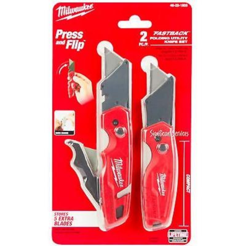 Both knives boast a press and flip mechanism for quick, one-handed opening and allow for tool-free blade changes. The metal extension over the button ensures maximum safety by preventing accidental blade removal. With a durable wire belt clip, you can carry them without worrying about pocket tearing. The metal body guarantees durability, and onboard storage accommodates up to 5 extra blades. Elevate your toolbox with the Milwaukee FASTBACK utility knife set today.