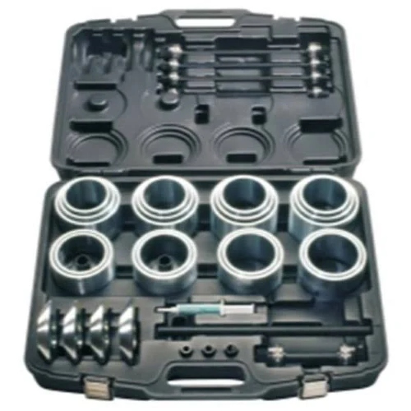 Universal Tool set for extracting and mounting: silent bearings, hydraulic bearings, ball bearings, rubber bearings, shaft seals, bearing brush, etc.Universal application makes it ideal for various vehicles.Includes: 20 sleeves, 4 spindle, 4 discsUsed for