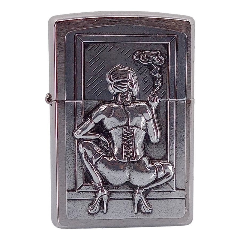 Original Windproof Zippo Benzin Lighter -Smoking Womanmotiv p en Brstet Chrome Zippo base - dekoreret i Tyskland ! Smoking Woman i korset og hje hle- megetdristig model der bnes p den kinky mde En rigtig frk sag der nok skal inspirere noget Zippo trning gt