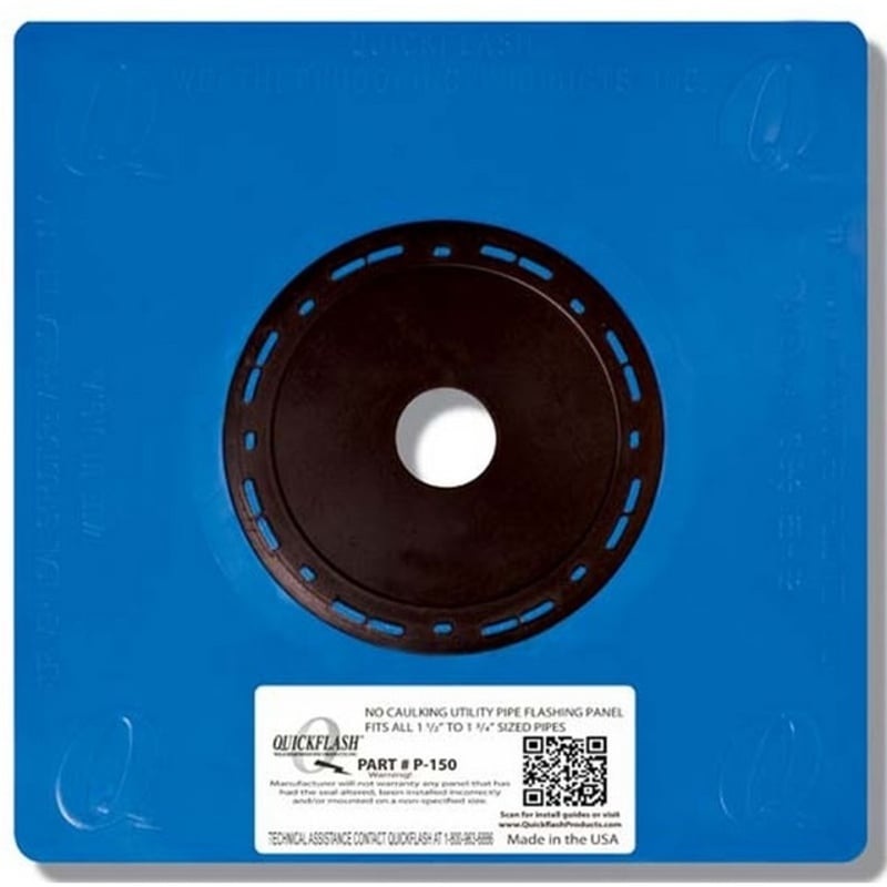 Fits 1 1/2" to 1 3/4" sized pipes - copper, rigid, and PVC and ABS. Also used with electrical pipes through brick and stone veneers. 11 1/8" x 11 1/8" x 3/32" Depth: 3/32 inHeight: 11 1/8 inWidth: 11 1/8 inStandards: California Proposition 65