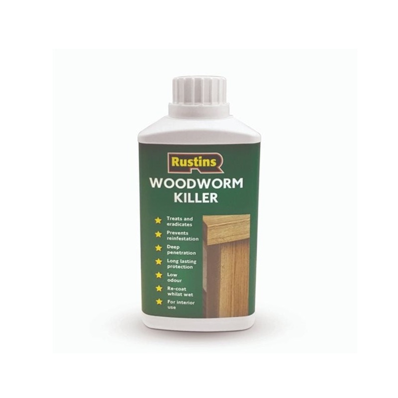 Woodworm Killer 250mlRustins Woodworm Killer is a low odour, deep penetrating treatment. It treats and eradicates and prevents reinfestation.It gives long last protection. Re-coat surface whilst wet. Suitable for interior use.Treats and eradicatesPrevents