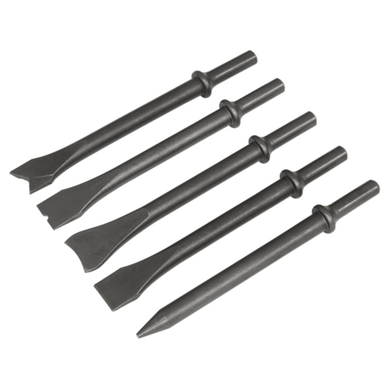 Set of air chisels suitable for Sealey and other leading brands of air hammers. Includes five chisels with different head shapes. Ideal for hard surface break up and chiselling.