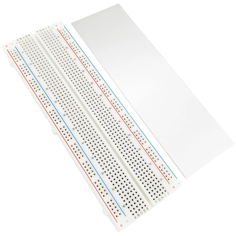 The 03MB830 is a solderless (plug-in) breadboard with 830 connection tie-points (i.e. 830 wire insertion holes). It has 4 power rails. Solderless breadboards are great for building and testing new circuits because parts can be easily inserted and removed. They are completely re-usable. The 03MB830 has a 630 tie-point IC-circuit area plus four 50 tie-point power rails. The housing is made of white ABS plastic, with a printed legend giving numbers and letters for columns and rows. The internal contacts are phosphor bronze with a plated nickel finish. A peelable adhesive tape backing is provided for attaching it to a surface and an optional metal back plate is provided. Lead-Free and RoHS Compliant. Finished projects can be moved to our 0302PB10 solderable PC breadboard to make them permanent.