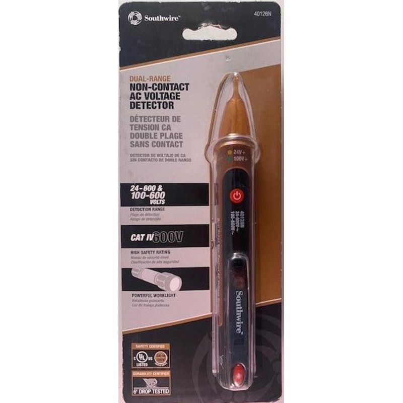 Southwire 40126N Southwire Dual Range Non-Contact AC Voltage Detector CAT IV 600VSouthwire's dual range non-contact voltage tester offers a fast way to check power on AC circuits from 24 to 600 V. simple one button operation.A bi-color LED indicates the te