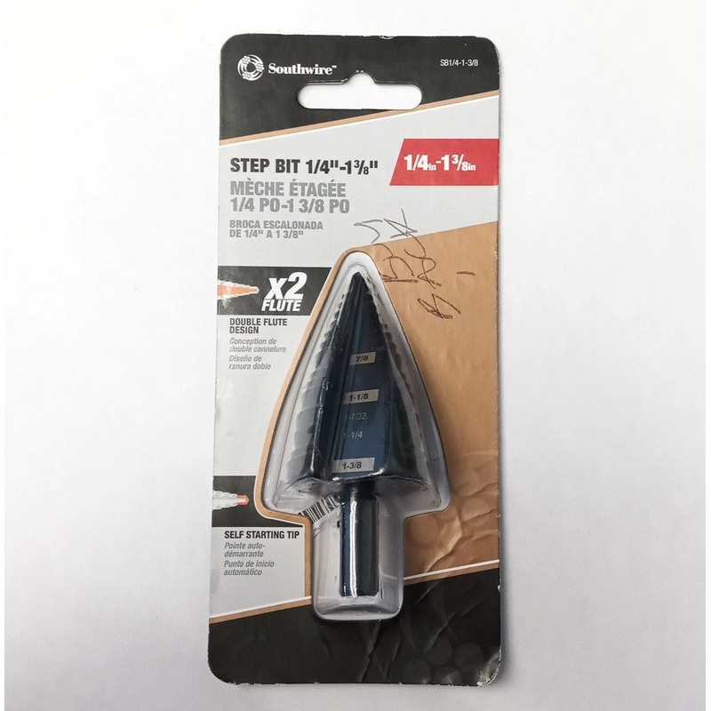 Southwire SB1/4-1-3/8 Step Bit, DBL Strt-Flute, 1/4" to 1-3/8"FEATURES: Split point self-starting tip requires no pilot hole and penetrates faster. Tri-lobe shank reduced slippage and firm grim in the chuck. Laser etched sizes for easy identification. Doub