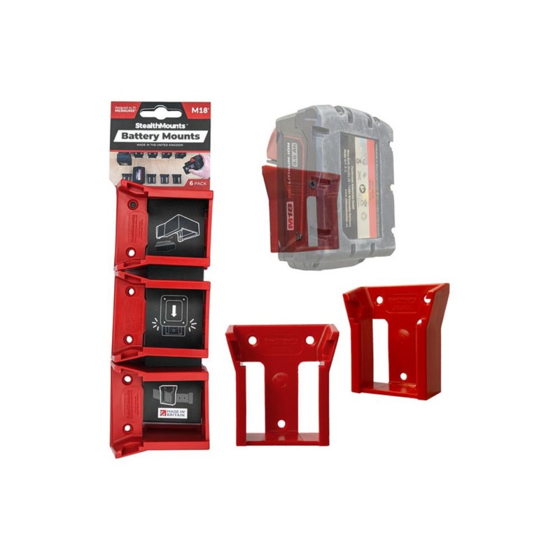 • StealthMounts Battery Mounts for Milwaukee M18 cordless batteries keep your batteries organised and exactly where you need them. Batteries fit by clicking into the holder and are only released by pressing the release button on the battery. Batteries can be held at any angle locked in the holder and will not fall out even whilst travelling. Perfect for mobile setups or workshops! Manufactured in the United Kingdom our Milwaukee M18 Battery Mounts are made using extremely durable injection moulded ABS plastic with countersunk screw holes to allow for firm mounting on multiple surfaces. Great for keeping track of your batteries and staying organised. They can be mounted at any distance from one another and in tight spaces for maximum workshop efficiency. Mount them in your workshop, under shelves, toolboxes, tool trailers or in your work vehicles with due care. They can also be looped through a belt for use on the job site. StealthMounts Battery Mounts are available colour coded to match your Milwaukee platform.